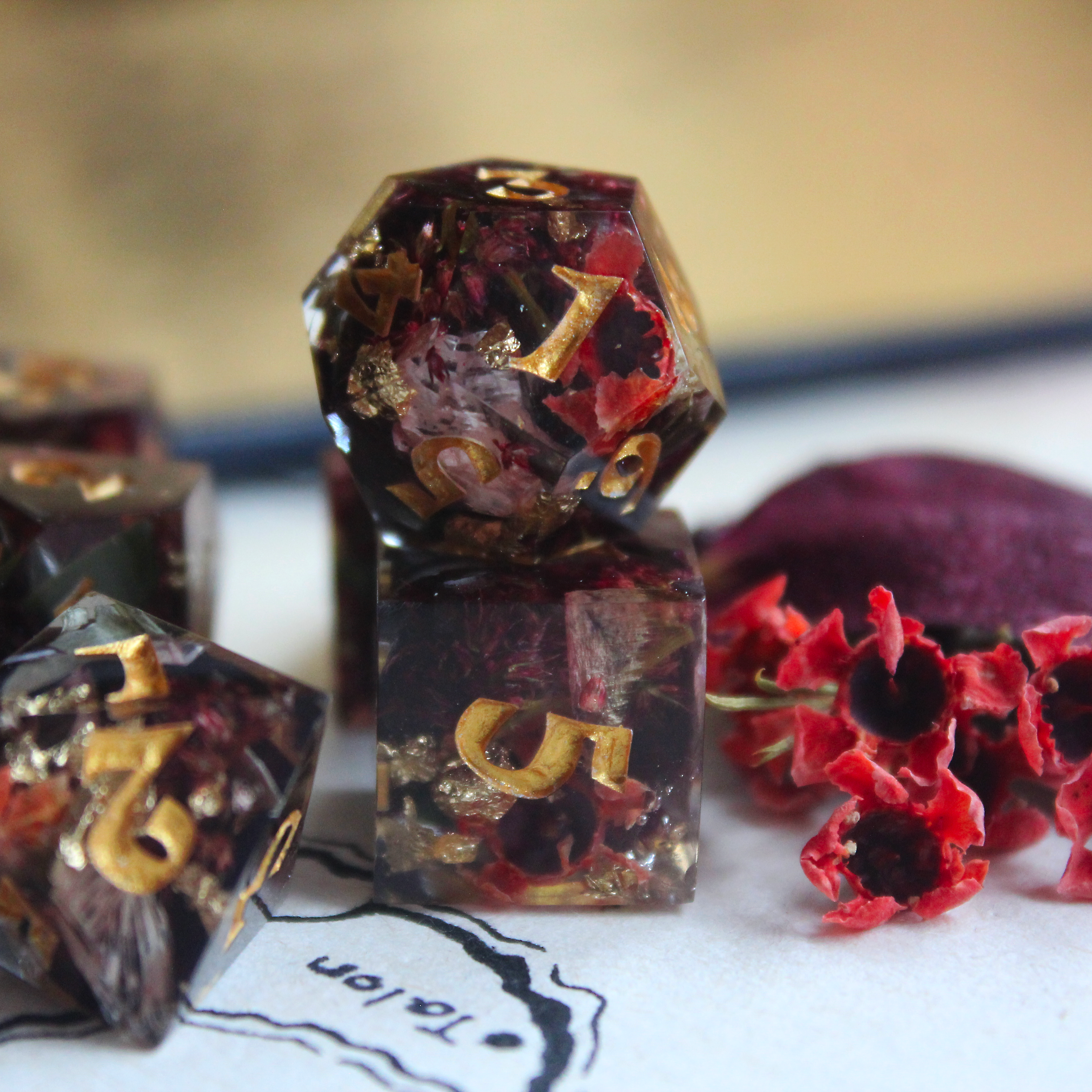 We can customise the dice with inclusions like 3D-printed figures (like skulls, brains, eyeballs, etc.), florals, colours, sparkles, and more. Pitch us your dream and we'll fly with it.