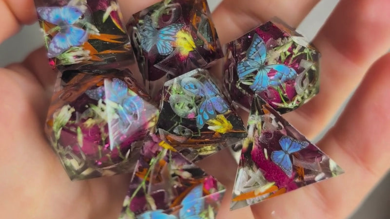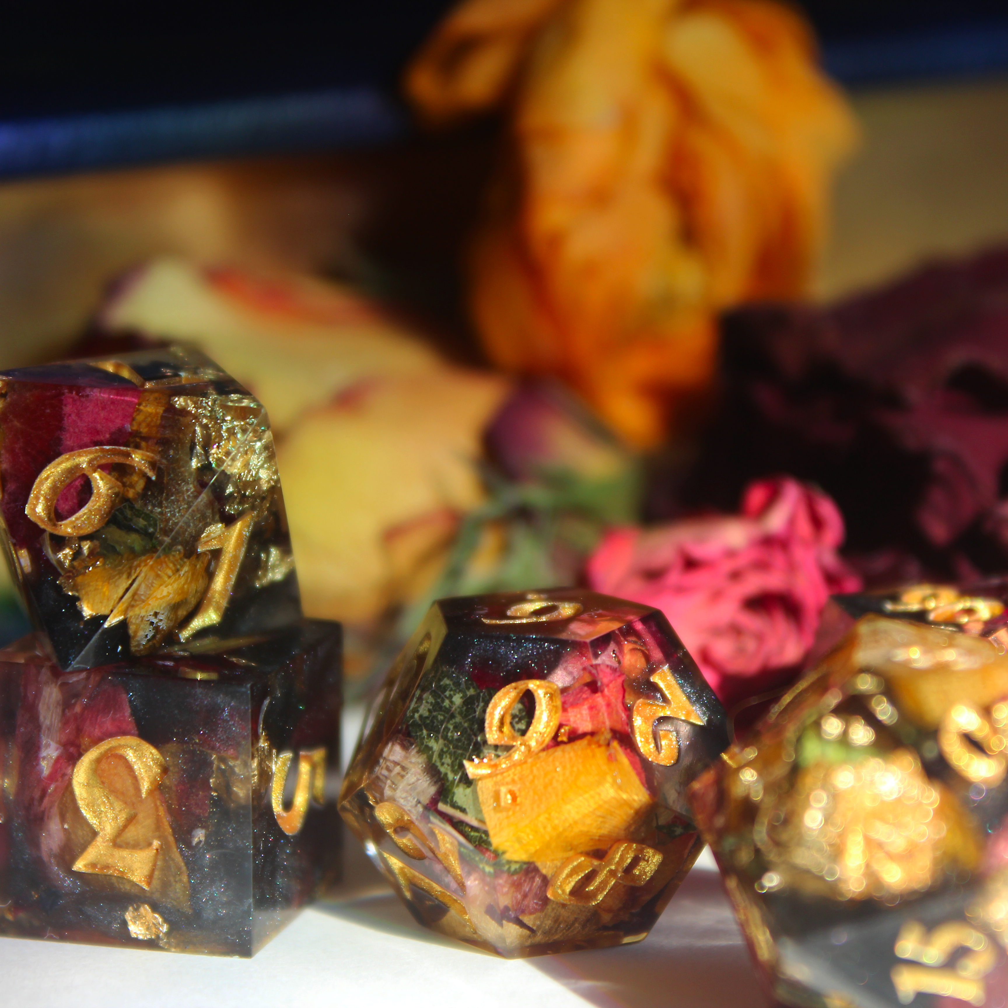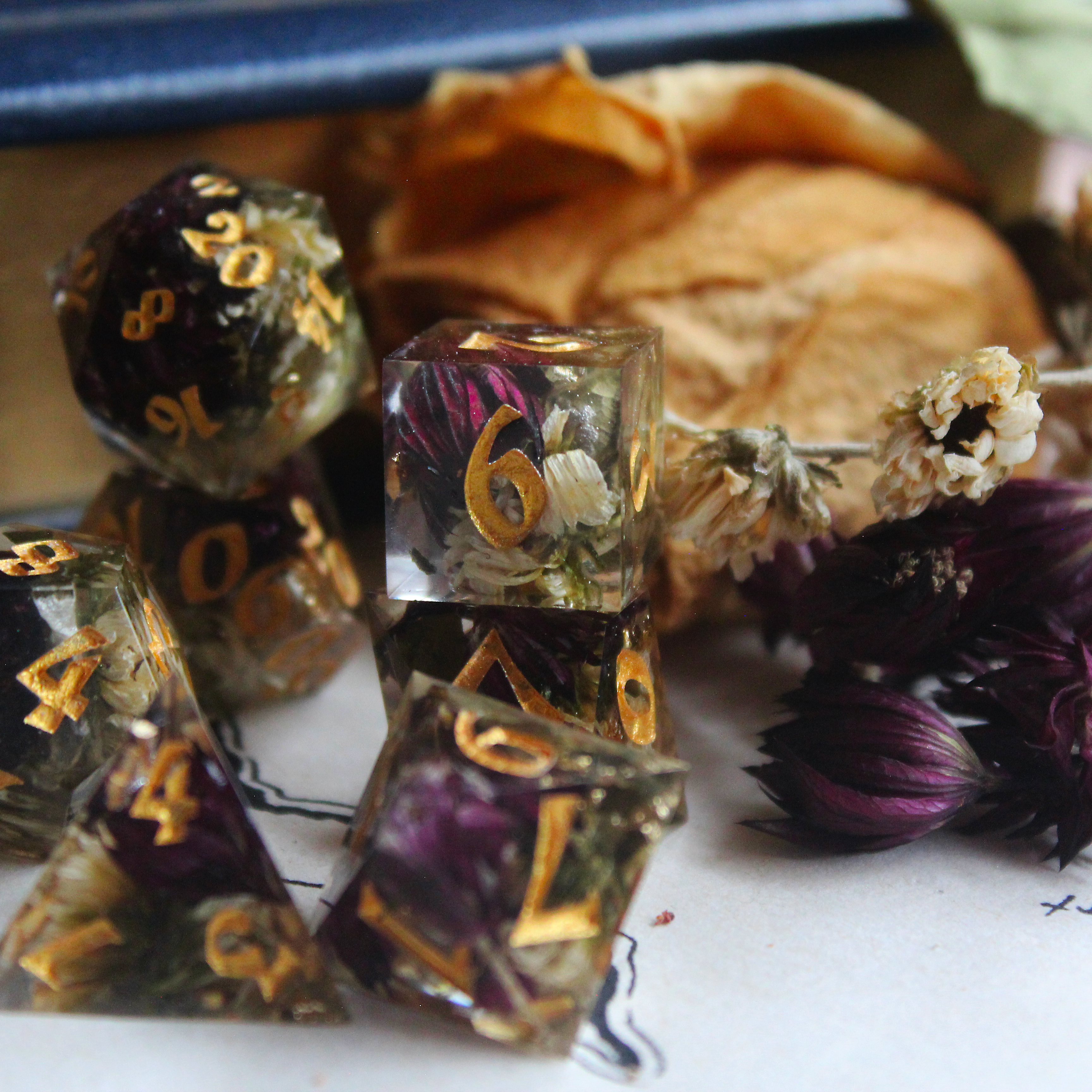 The amount of flowers we will need for a set is approximately a small Tupperware container's worth. If the flowers are large, they will be torn up to fit inside the dice. If the flowers are super small, make sure there are at least 7 of them to feature one in each dice. Any unused flowers will be returned to you with your dice set/s (unless you want us to keep them).