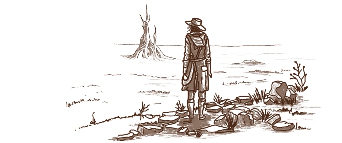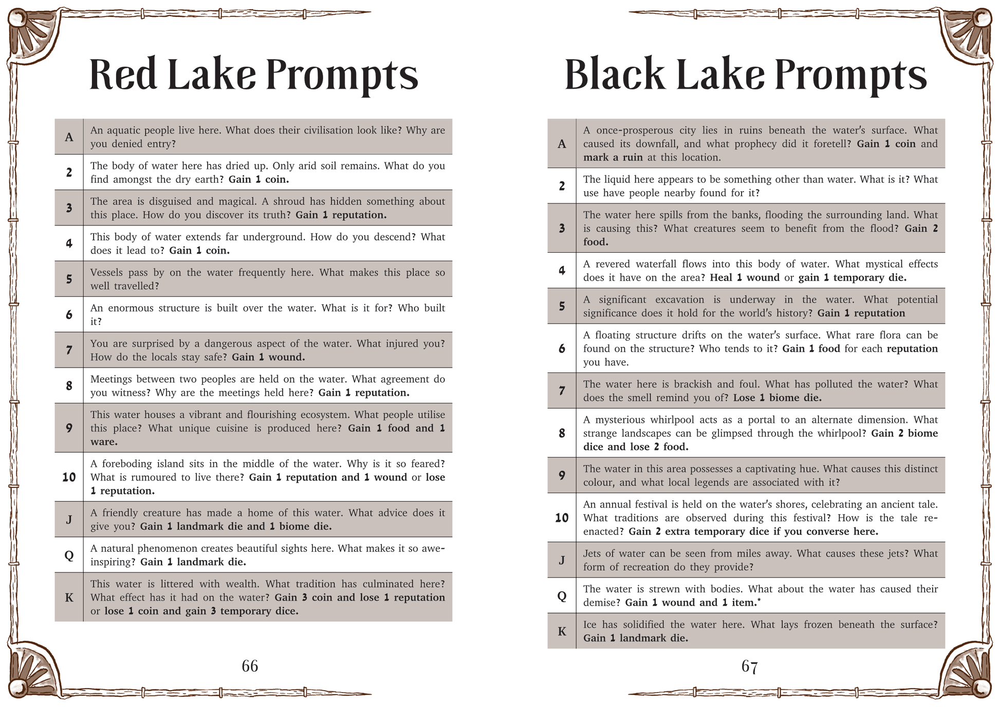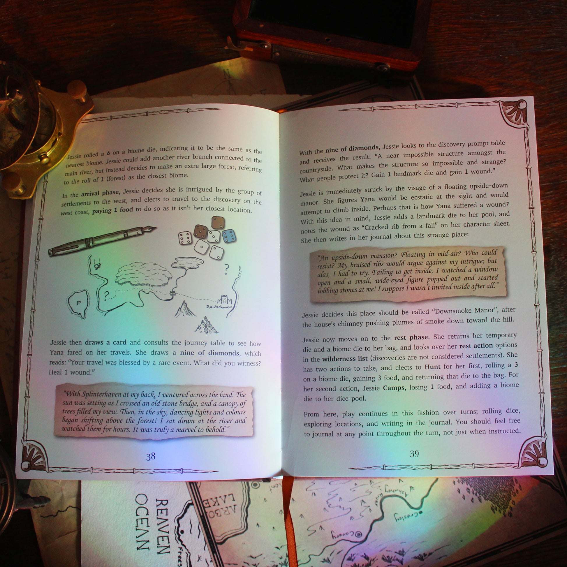 The core rules are easy to learn, and facilitate the creation of a world map through a variety of prompts and tables. By the end of a game, you will have produced a map of an unknown world, complete with a journal that details those places.