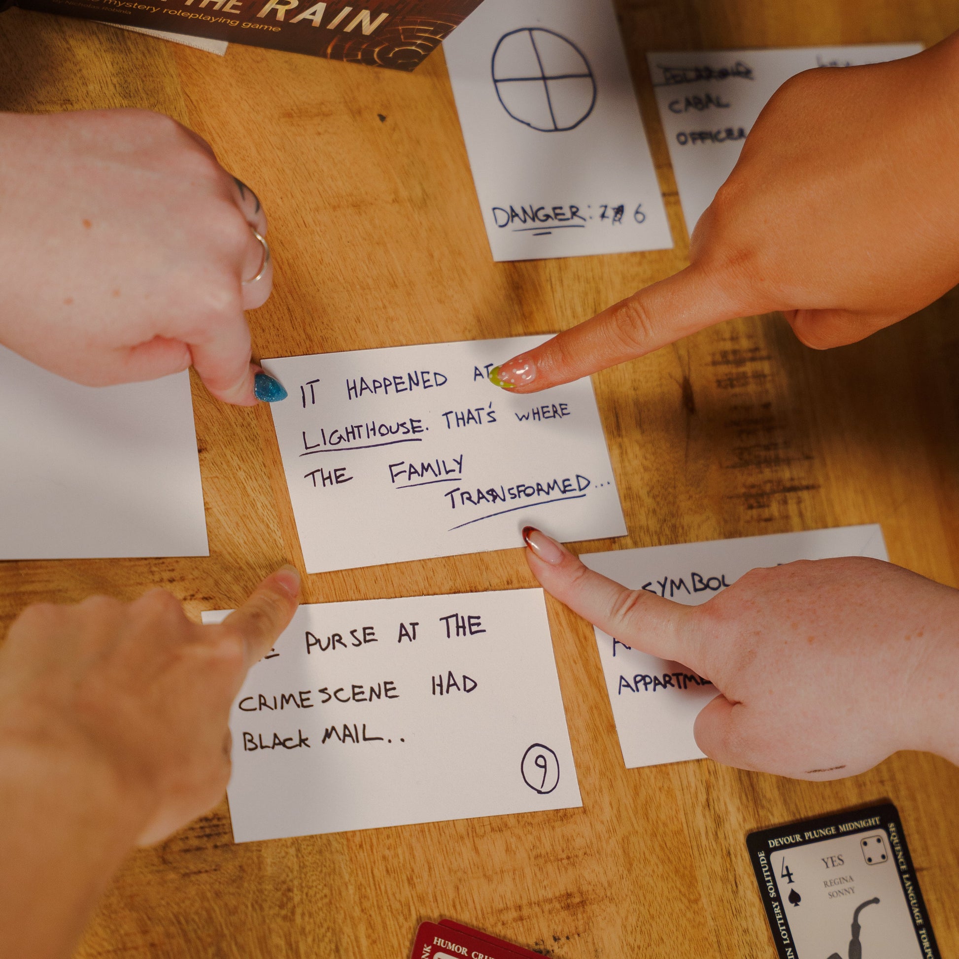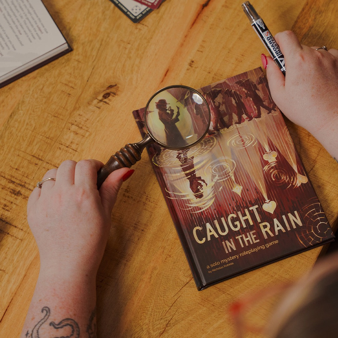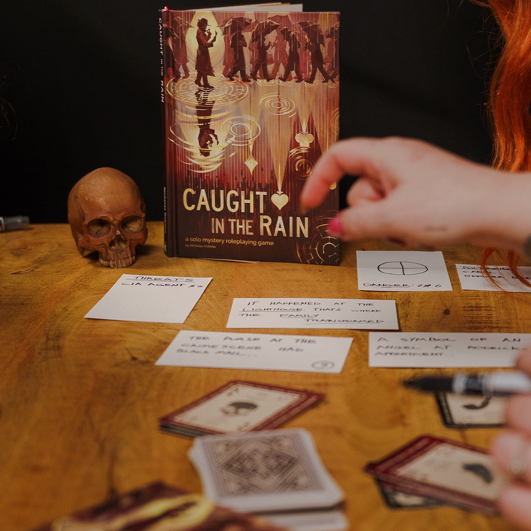 Caught in the Rain is a solo TTRPG where the player delves into a mystery that must be solved before the weight of it is too heavy and the house of cards comes crashing down. The thing we love about our solo mystery RPG is that the truth is hidden until the very end, offering a satisfying player experience without the company of another player.