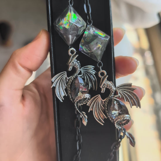Thick black glasses chains with gunmetal silver dragons holding a dark grey crystal.