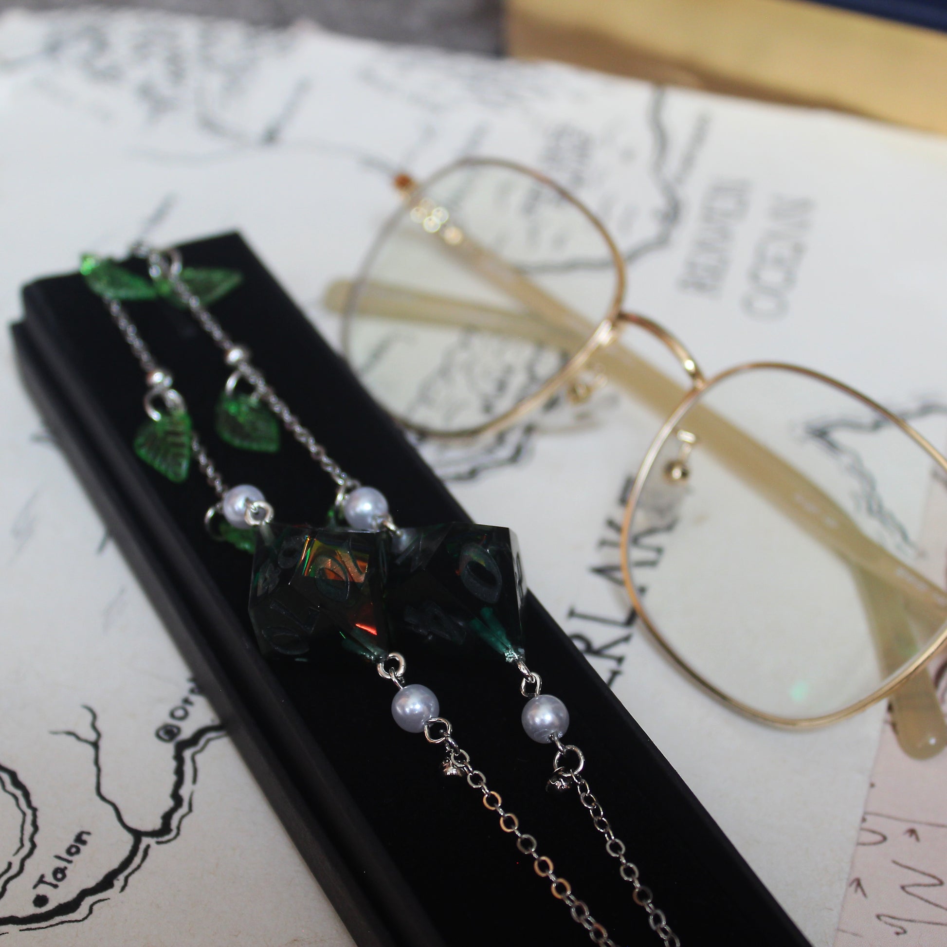 The two dice on this glasses chain have a deep, warm emerald-green colour, like you'd find on the leaves of trees far into the forest.
