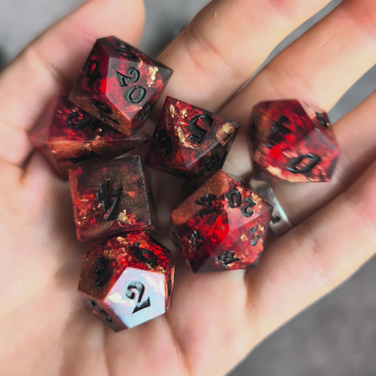 These beautiful dice are made with a red pigment, gold flake chunks, and bronze shimmer.