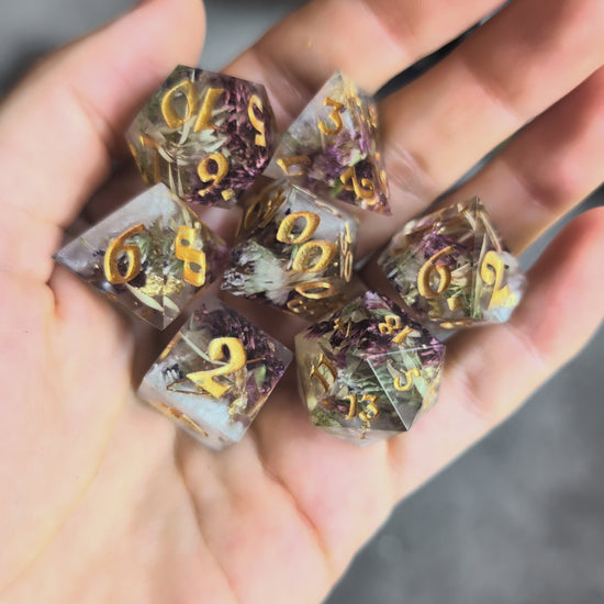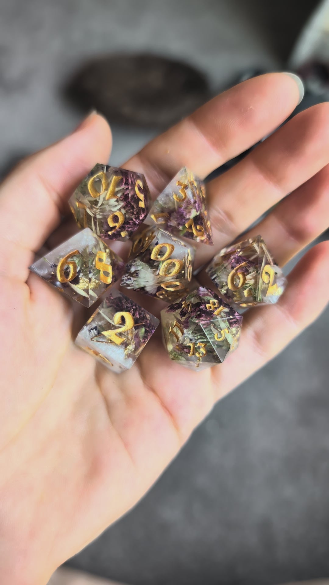 These beautiful dice are made with a white shimmery pigment, pink, green and light blue dried florals, and gold flakes.