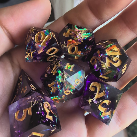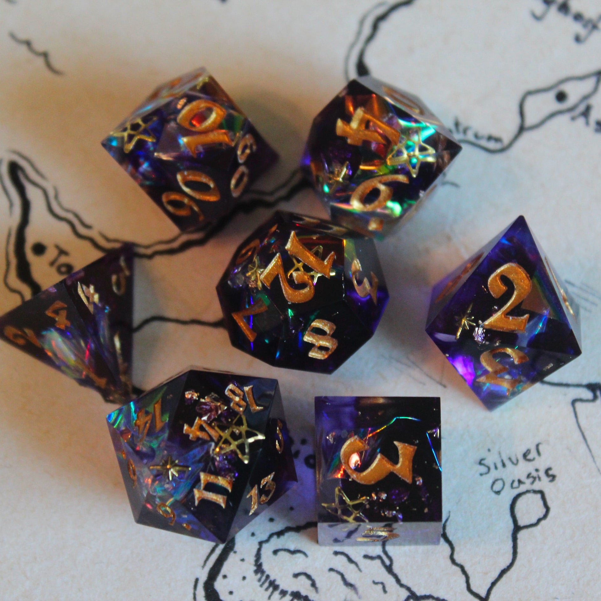 These beautiful dice have a dark purple and gold pigment with cellophane, gold flakes, and gold stars.