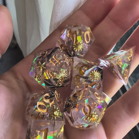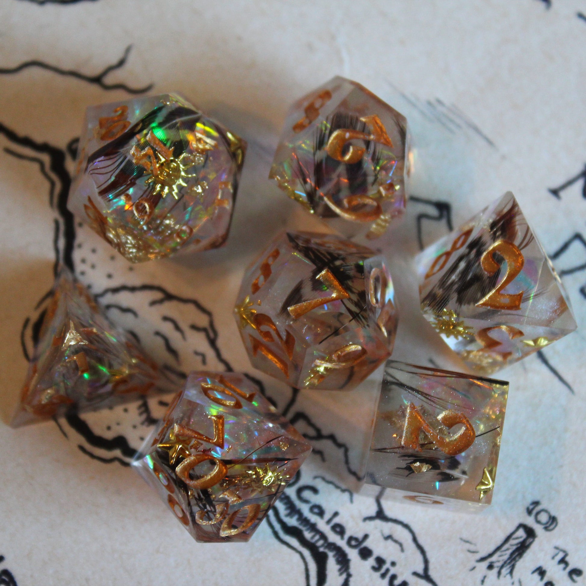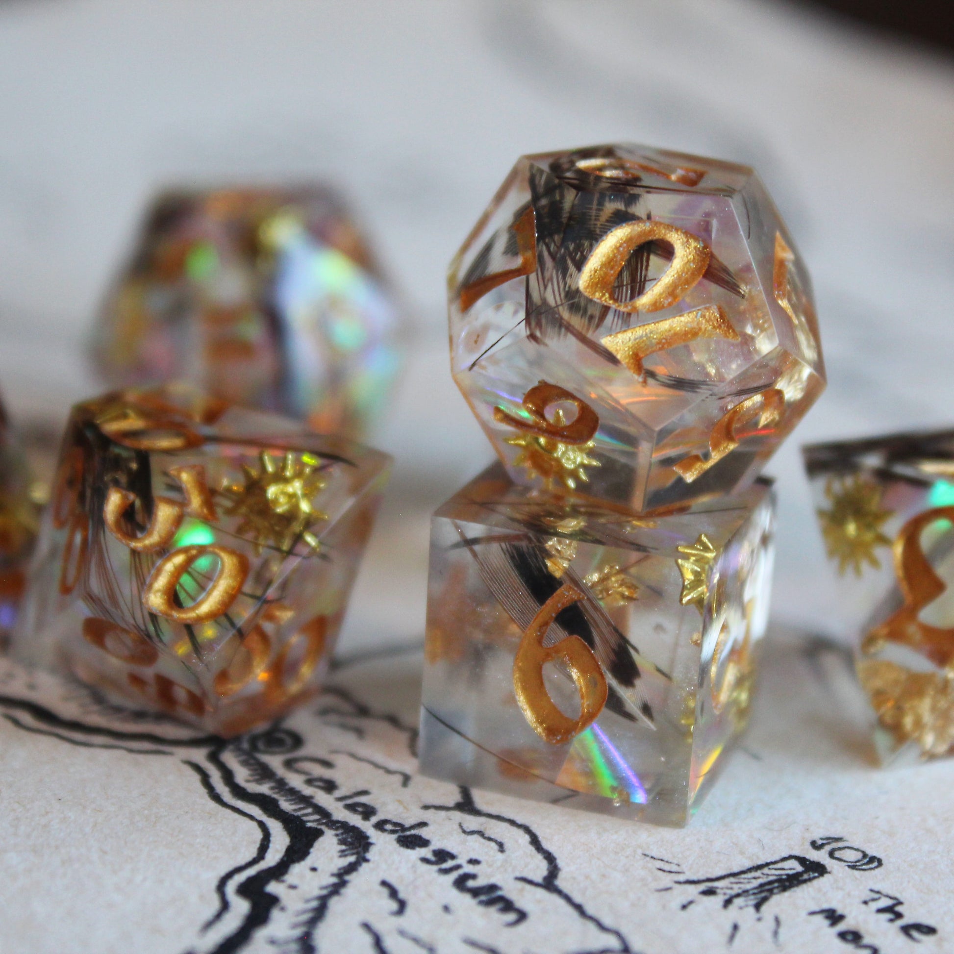 These gorgeous dice have cellophane, gold flakes, feathers, and golden suns and stars inside.