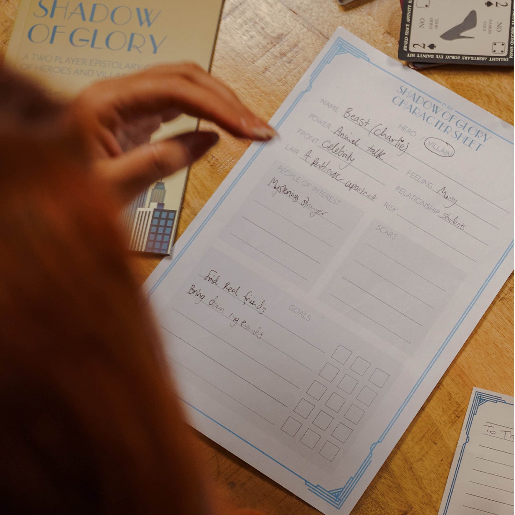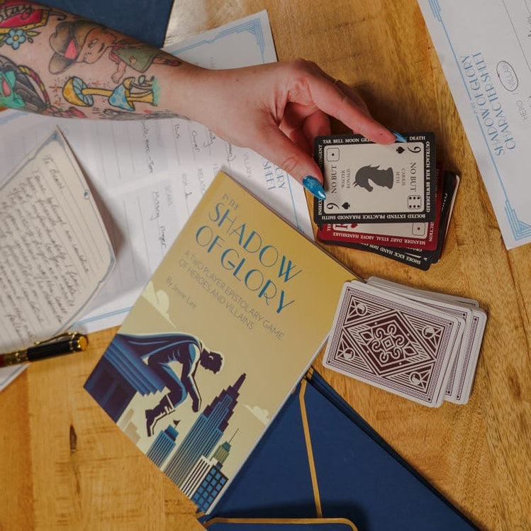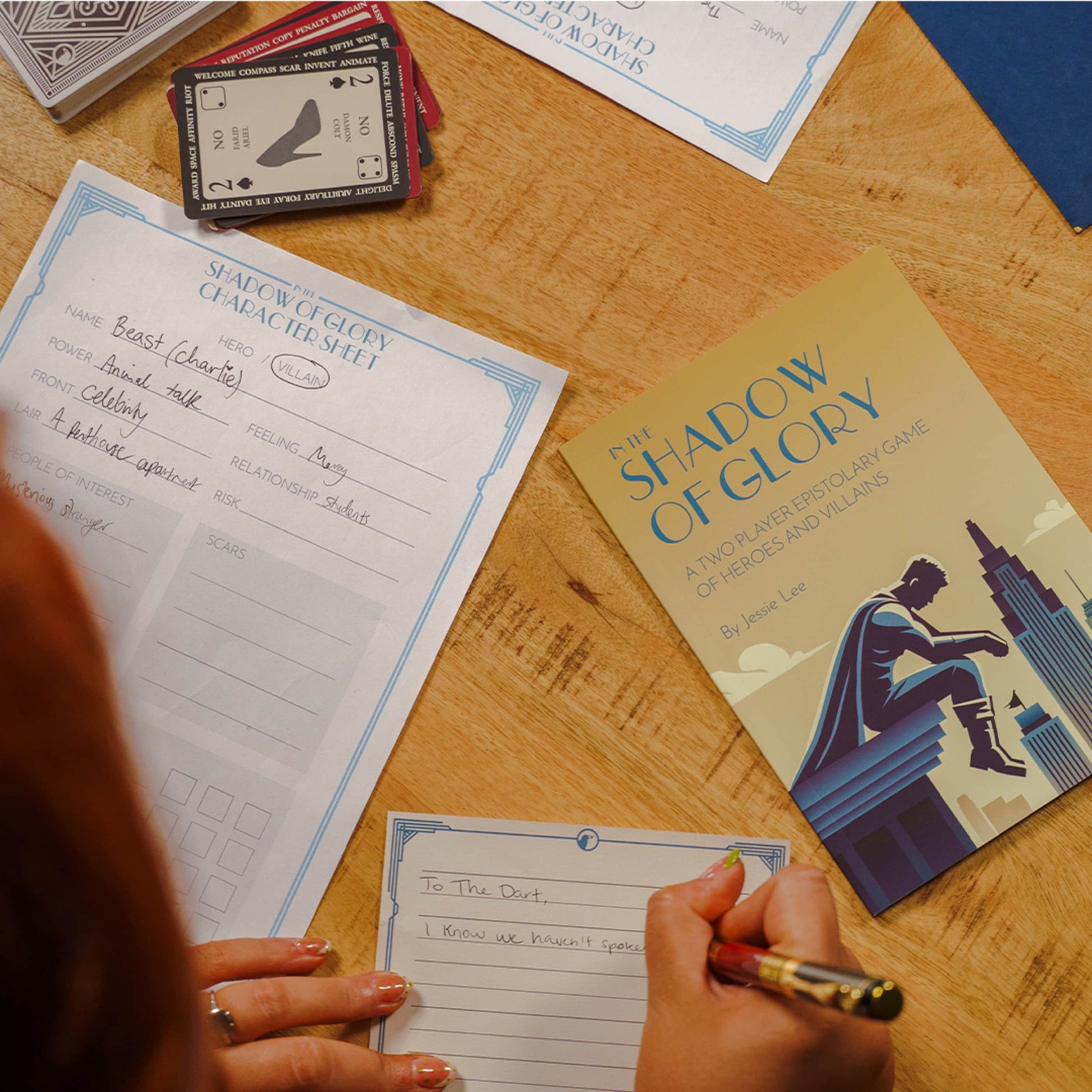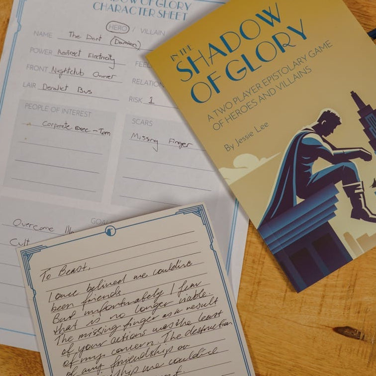 In the Shadow of Glory is a two-player epistolary Tabletop Role-Playing Game (TTRPG) of flawed heroes and broken villains. One player is a hero who has gone unmatched, and the other player - their arch nemesis. Both have been unable to thwart the other, and have resigned to coexisting. Explore the nostalgic relationship between two long-lost foes as they both struggle with the weight of ultimate power.