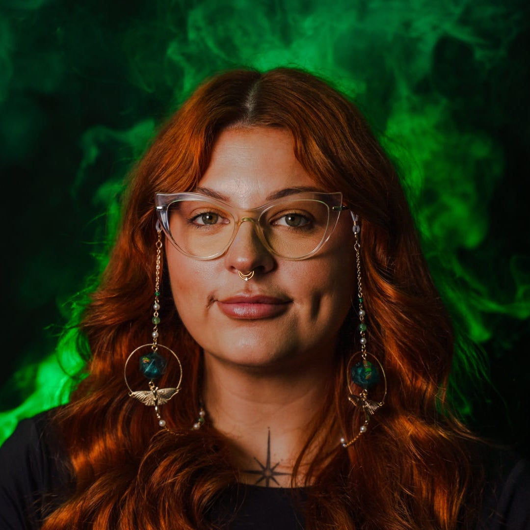 Gold-coloured glasses chains with adjustable silicone loops and white and green beads. The gold circle holds a golden moth at the bottom, wings in the air like it's in flight.
