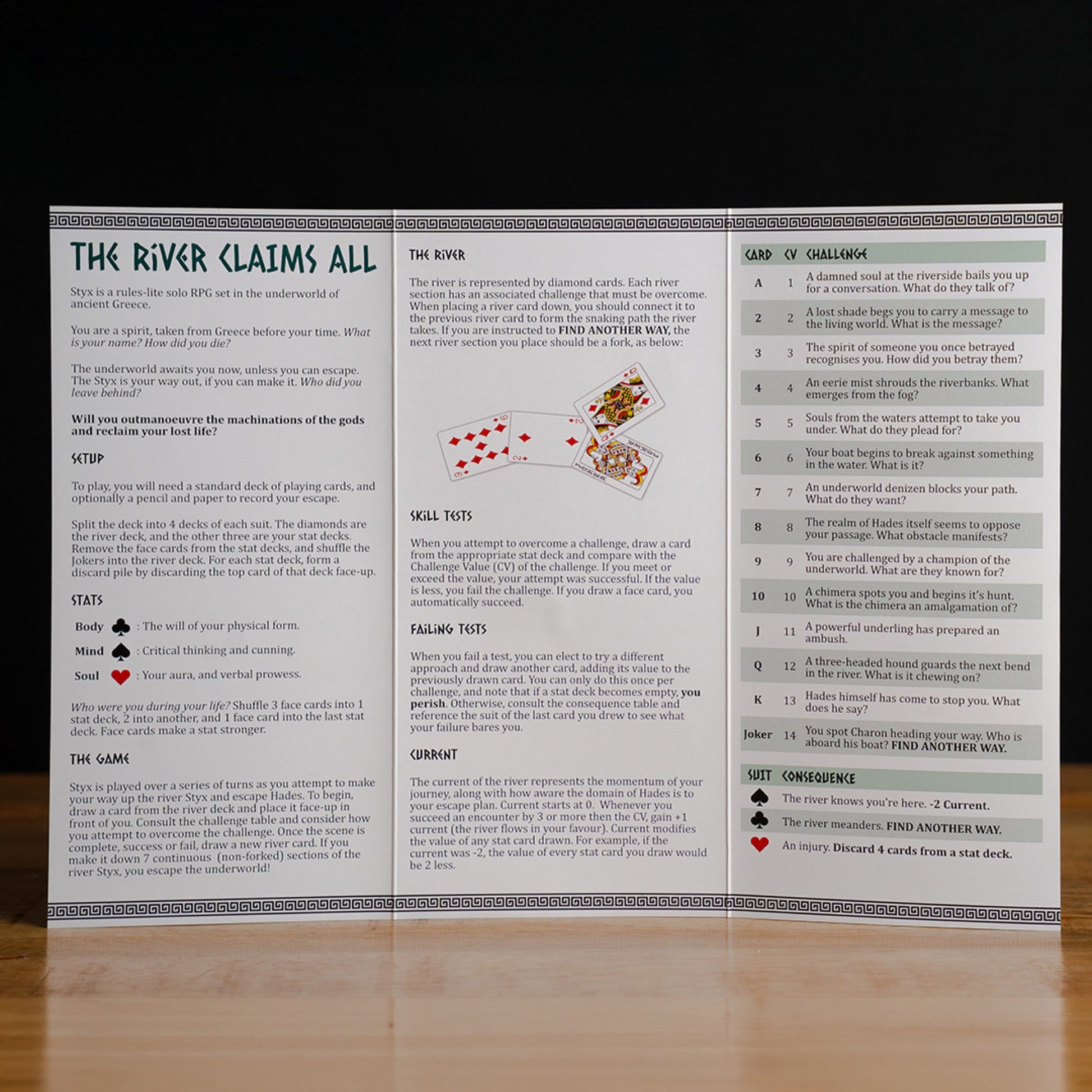 Styx was created for the One-Page RPG Jam 2023. A solo one-page TTRPG inspired by the video game Hades by Supergiant Games, and Golem by The Bardic Inquiry (find it here: https://thebardicinquiry.itch.io/golem)