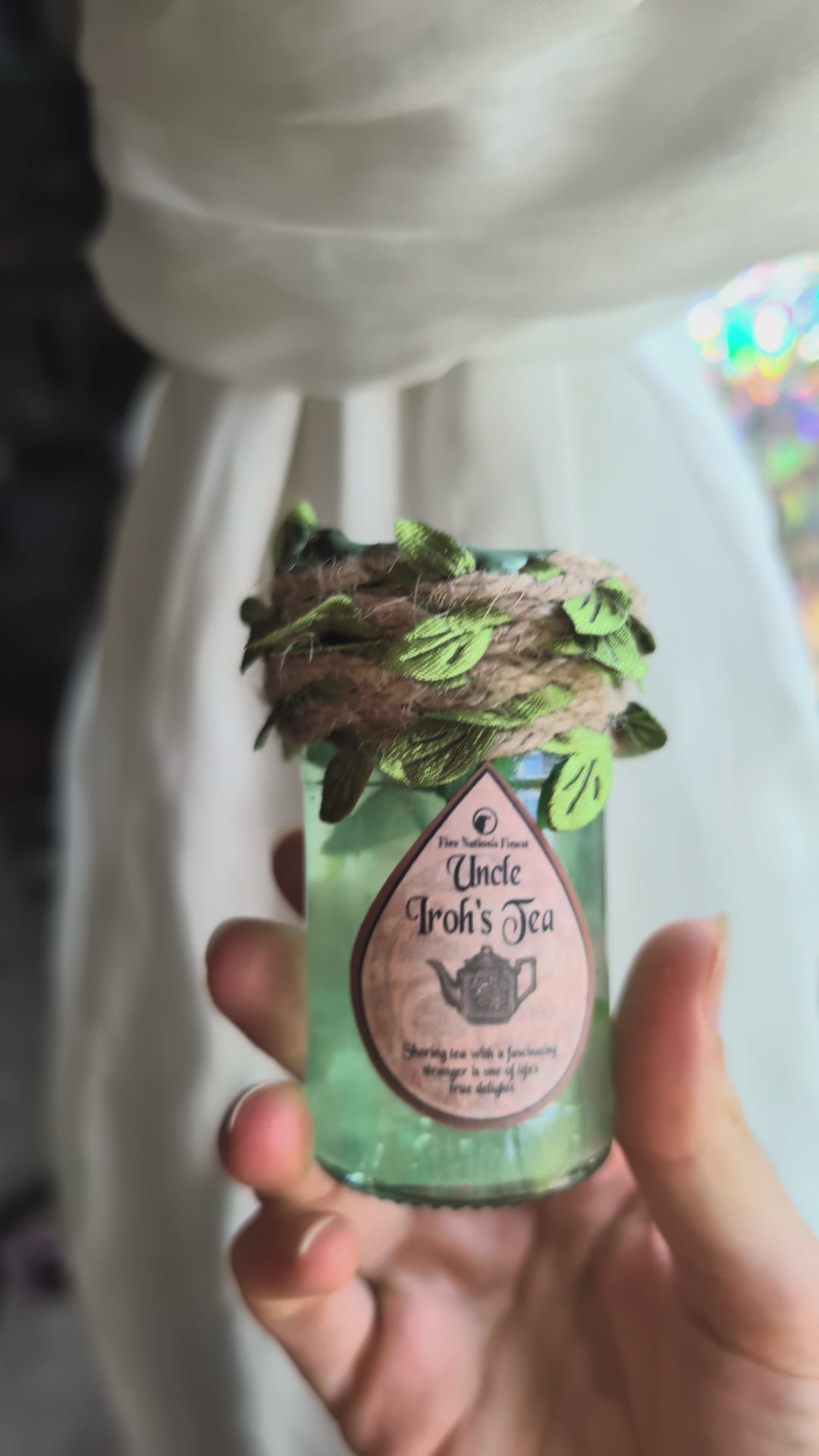 This potion was inspired by Avatar: The Last Airbender. It features a clearish light green solution with a 'tea' plant and magical dust.