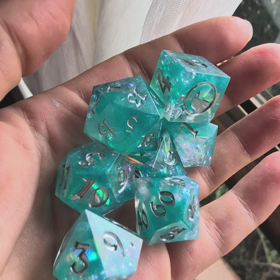 These beautiful dice have resin beads for 'bubbles', cellophane, and tropical teal pigment.