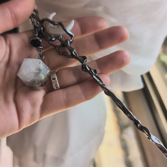 Pearly white and goblin gold. The witchy stick features a moon-shaped crystal.